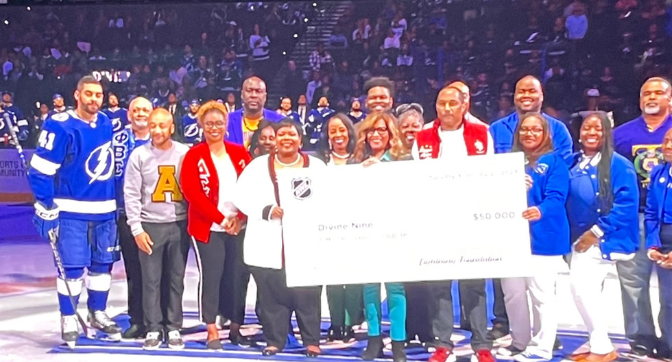 Pi Iota Chapter along with the Divine Nine (D9)was awarded a community heroes award by the Tampa Bay Lightning along with a recognition from the National Hockey a League for our outstanding contributions and n the Bay Area. This is the first such recognition by the NHL to any D9 organization. Total award of $100k was split between the groups. Omegas 1/9 was divided between the Pi Iota Chapter and EMM for contributions to each Chapter’s scholarship. Basili and chapter presidents were on the rink to drop puck. A momentous honor for all involved.